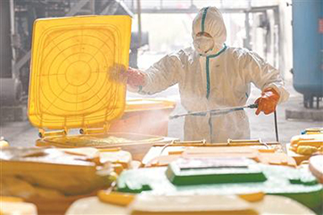 新冠肺炎疫情发生后,,,每天产生的巨量医疗废物成为武汉市亟待解决的重要问题。。图为近日,,,在武汉市青山区云峰公司,,工作人员在对医疗废物转运箱消毒。。新华社记者 才扬 摄3月11日,,记者从国务院联防联控机制新闻发